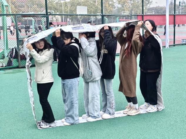 在这个考验团队默契的环节中,各小组需要在一张不断缩小的报纸上确保所有成员都能站稳。随着报纸面积的逐渐减小,队员们紧密相拥、相互扶持。当有的小组因失去平衡而"落水"时,收获的是鼓励的掌声;当挑战成功时,全组都会爆发出胜利的欢呼。这个游戏让同学们深刻体会到,在团队面临困境时,相互信任和协作才是克服困难的关键。