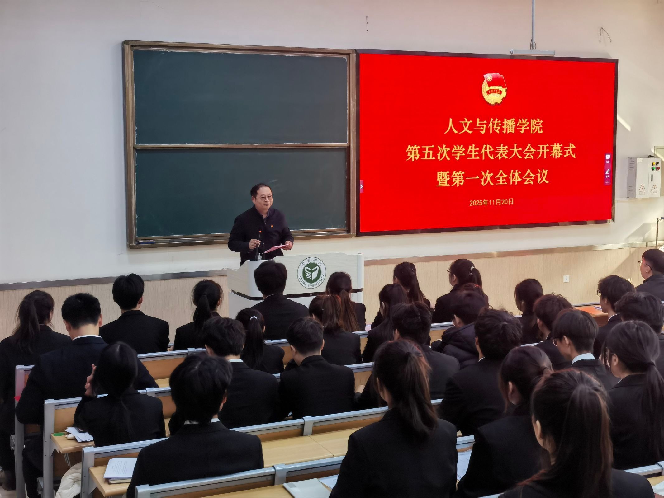 大会在庄严的国歌声中拉开序幕。徐俊凯代表我院党委向大会的召开表示热烈祝贺。他指出,回顾过去一年,我院学生会以习近平新时代中国特色社会主义思想为指导,引领青年学生勇担使命,在思想政治引领、促进学生成长成才中贡献了青春力量,发挥了骨干带头作用。他充分肯定了随后他提出四点期望:一要以人文之光,照亮青春征程。立足学院“文以载道,传以通心”的育人使命,从经典文化到数字传播的实践中,厚植人文底蕴、锤炼传播能力;二要以传播之力,讲好中国故事。在信息时代里,既要掌握传播技术,更要扛起责任 用中国话语向世界传递声音;三要以学生为本,共筑成长平台。依托学代会的民主渠道,延续“学风提升”“权益保障”等主题工作,深化品牌活动,优化“学生-学院-社会”联动机制,切实解决学生的实际需求;四要以实干为笔,书写时代答卷。将个人理想融入国家发展,在AI浪潮中守住人文温度与价值底色,以实干回应时代召唤。