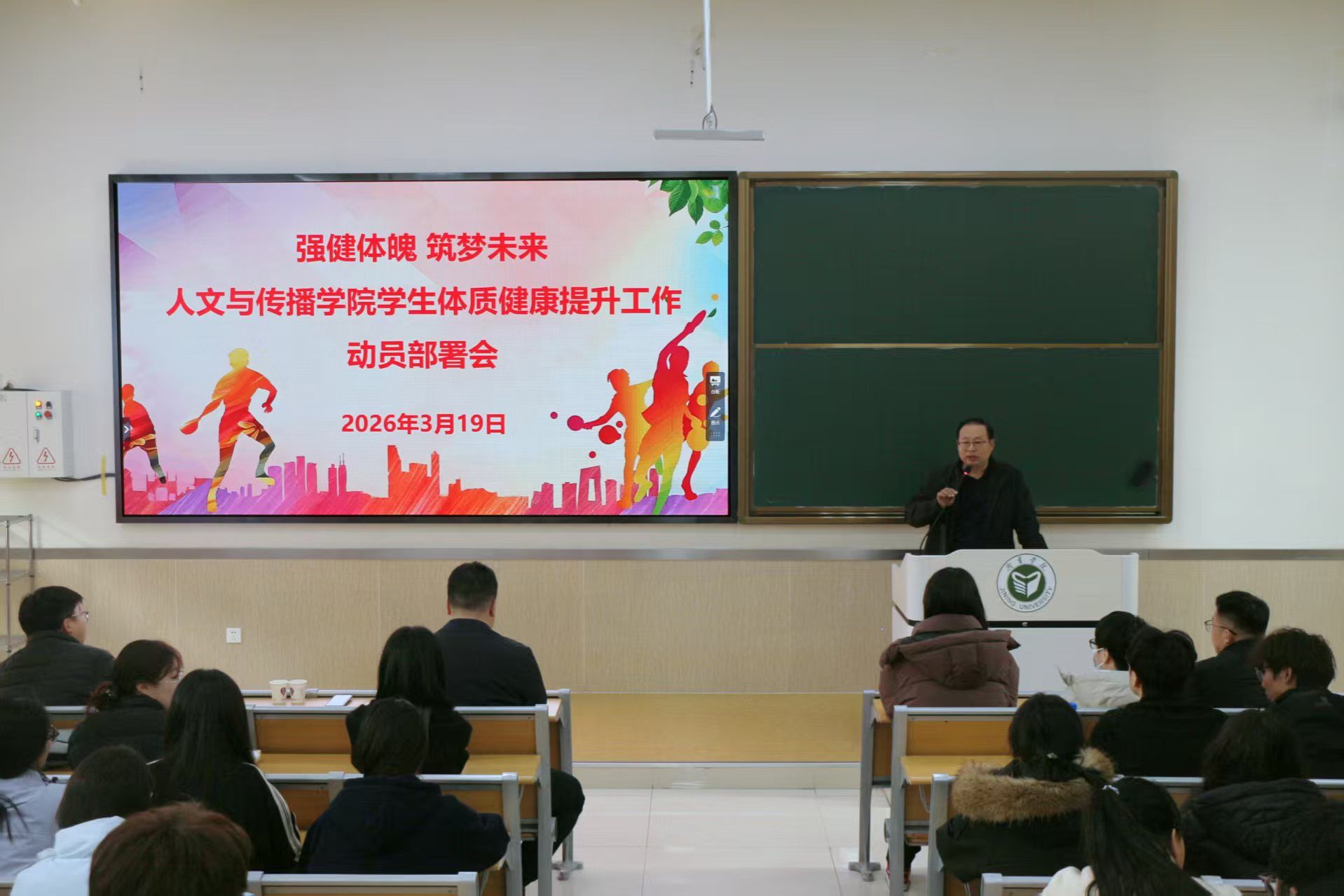 为深入贯彻学校关于学生体质健康工作的部署要求,扎实推进学生身体素质提升工程,3月19日下午,人文与传播学院在2B102教室召开学生体质健康提升工作动员部署会。学院党委副书记徐俊凯、团委书记倪召欣、全体辅导员,以及各班班长、体育委员和学生代表参加会议。会议由辅导员何维峰主持。