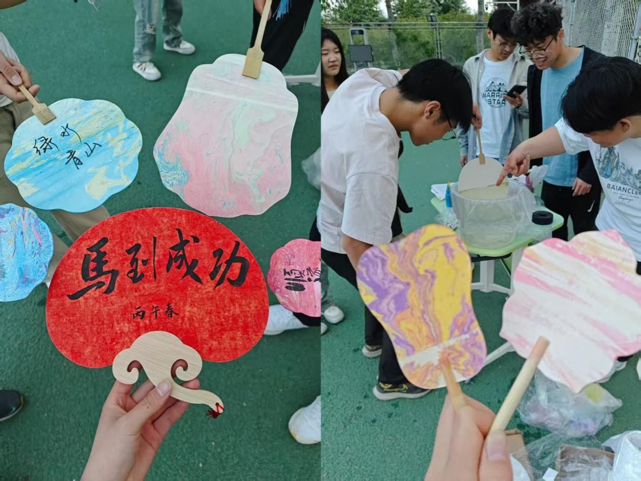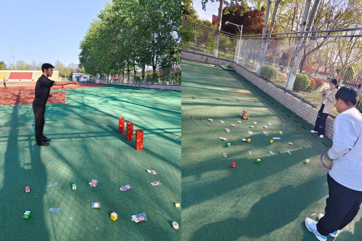 趣味互动体验同步开展,投壶、套圈、漆扇手工等项目深受同学们喜爱。投壶现场,大家凝神聚力、从容投掷,每一次精准入壶都赢得阵阵喝彩;套圈区域,同学们瞄准目标、大胆尝试,在趣味挑战中收获惊喜与欢乐;漆扇手工体验区内,大家静心创作、落笔生花,在一笔一画中感受传统手工的独特魅力,趣味十足的互动让欢声笑语充盈操场。
